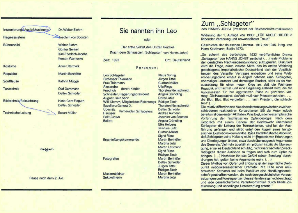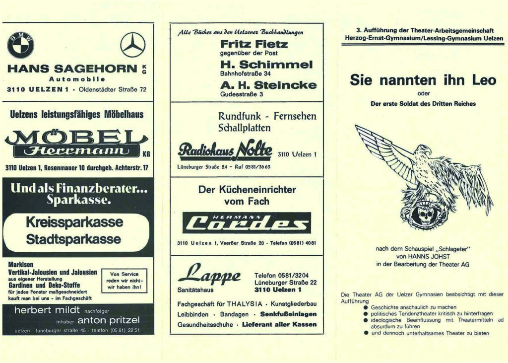 Am 23. März 1977 führte die Theater-AG des HEG und LEG das Stück ›Sie nannten ihn Leo‹, eine kritische Bearbeitung des NS-Propagandastückes ›Schlageter‹ von Hans Johst, unter der Regie von Dr. Walter Blohm auf. Die Aufführung nahm einen denkwürdigen Verlauf: sie wurde von einigen Rechtsradikalen unter Führung des einschlägig vorbestraften Manfred Röder massiv gestört. Mit einem ›Erzählcafé‹, an dem auch einige damals Beteiligte teilnehmen werden, will die Geschichtswerkstatt Uelzen e.V. an dieses Ereignis erinnern und über einen angemessenen Umgang mit dem Thema ›Rechtsradikalismus‹ diskutieren.