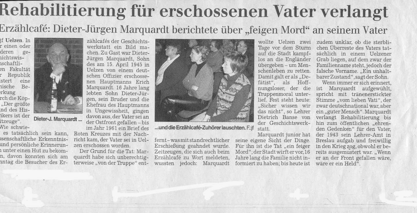 16 Jahre lang lebten Sohn, Bruder und Ehefrau des Hauptmanns im Ungewissen über das Schicksal des Vaters und Ehemannes. Erst 1961 informierte das Deutsche Rote Kreuz die Familie darüber, dass Erich Marquardt in Uelzen erschossen worden ist. Offizielle Begründung lautete »Unberechtigtes Entfernen von der Truppe«. Vieles spricht jedoch dafür, dass er Uelzen zwei Tage vor dem Sturm auf die Stadt kampflos übergeben wollte um Menschenleben zu retten.